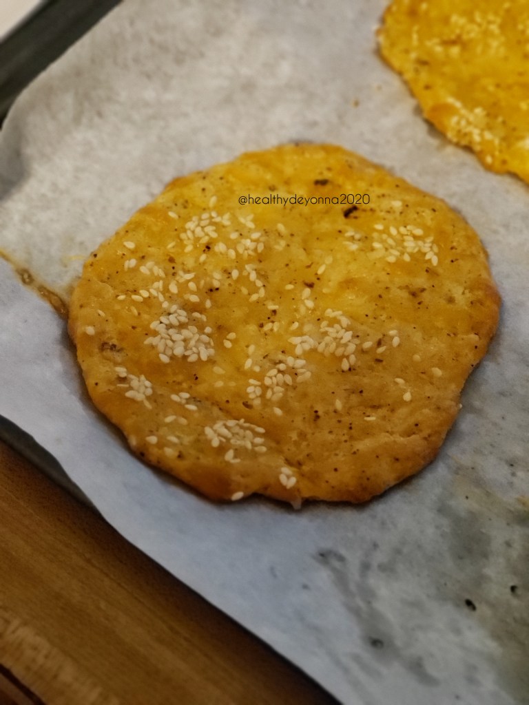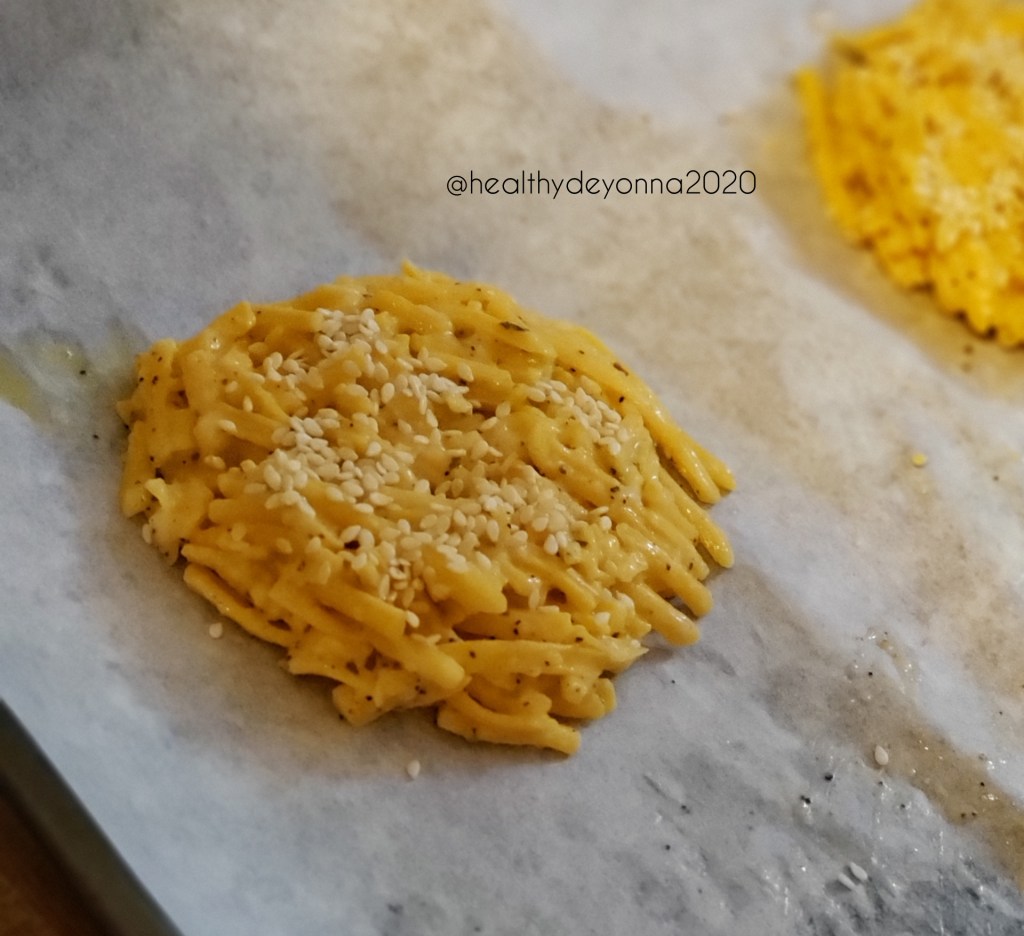 Use a 1/3 measuring cup (you can also use an ice cream scoop) to evenly distribute the cheese mixture on to the parchment lined sheet tray. (You do not need to spray the parchment with baking spray. The oil from the cheese will be enough to keep the bunz from sticking.) Use the back of the measuring cup to slightly flatten the bunz. Sprinkle the sesame seeds on top (you can omit this step if you do not like sesame seeds or have allergy related issues).