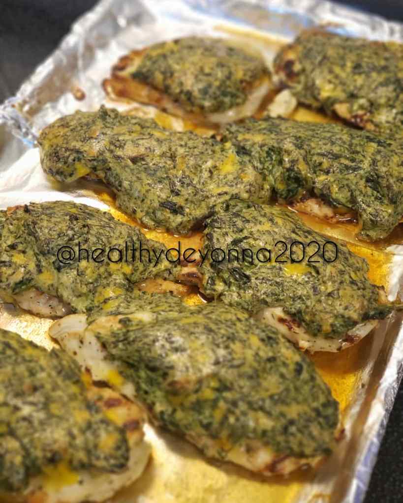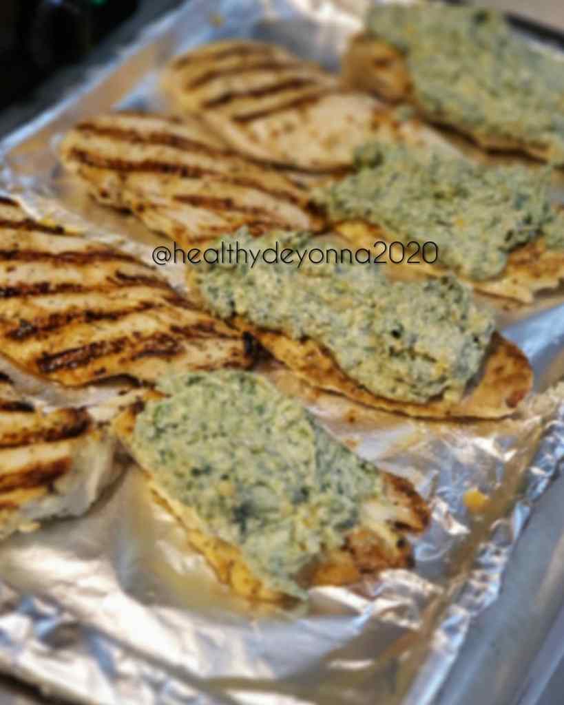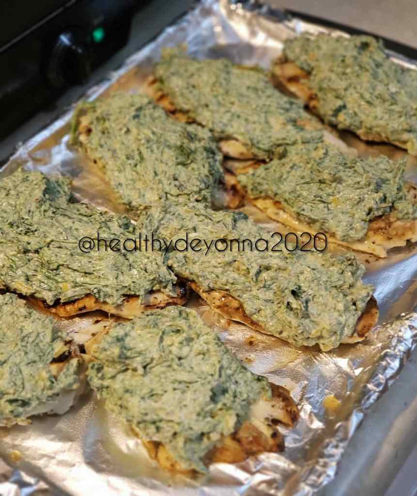 - Step 6: Take the spinach pesto mixture and top the chicken breast. Place the tray in the oven for 10 minutes. This will allow the chicken to finish cooking and the spinach pesto mixture to brown.