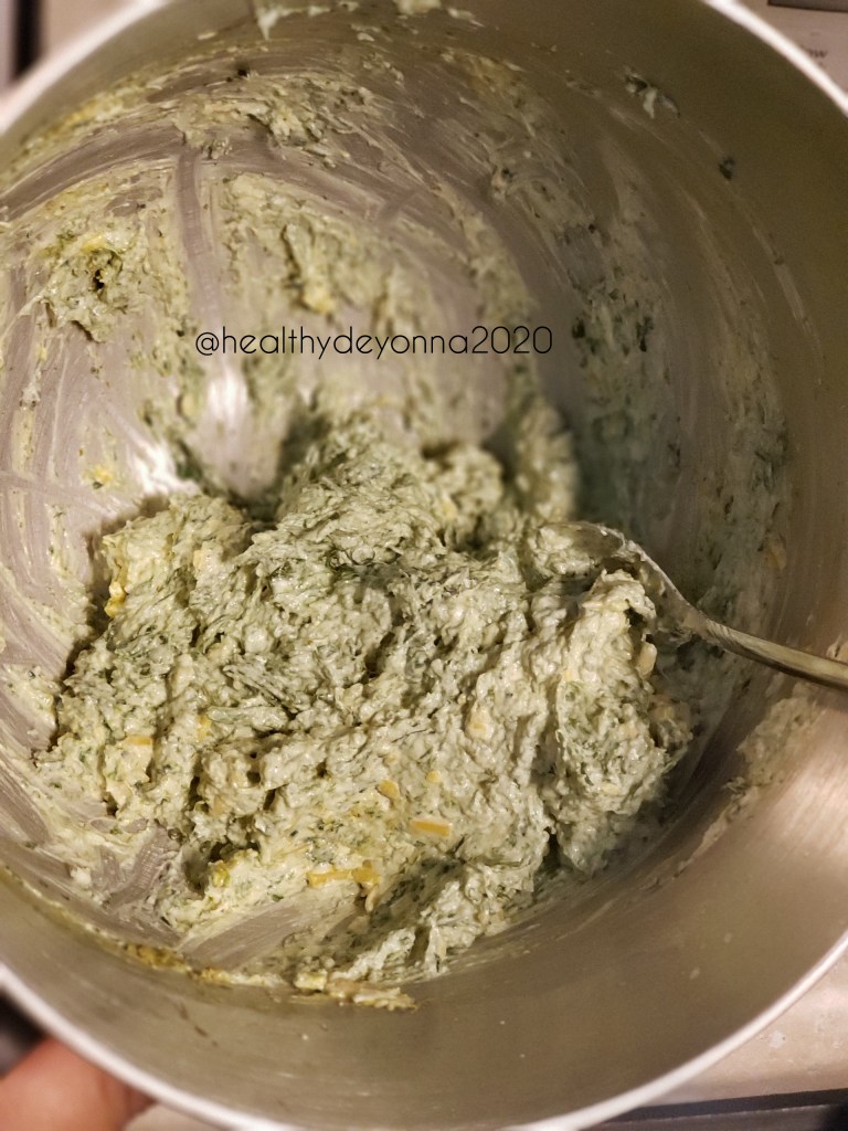 - Step 4: In a large mixing bowl (I use my kitchen aid mixer. I would suggest using a stand or hand mixer) add the cream cheese, mild cheddar cheese, and pesto. Mix until the ingredients have blended evenly. Add in the spinach and continue to mix on a low speed until all the ingredients have come together. Set aside for later.